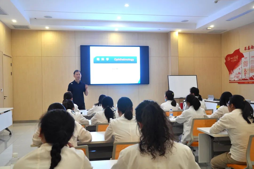 “眼球就像鸡蛋,巩膜和角膜就是外面坚硬的壳,葡萄膜和视网膜是中间那层膜,而膜的里面就是眼内容物……”3月15日下午,白继教授亲自为全员讲解眼科学相关基础知识,白继眼科2022年度三基培训也由此拉开序幕。